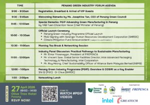 Designed as a collaborative space for industry players, the agenda features a high-level panel discussion on Practical Pathways to Sustainable Manufacturing with key industry leaders. The event culminates in the official launch of the Penang Green Industry Programme (PGIP) and the COSIRI framework, alongside a strategic MOU signing with SHRDC to formalise statewide capacity building.